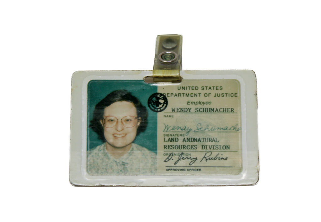 Identification badge for Wendy Schumacher while she worked in the Land and Natural Resources Division of the United States Department of Justice, 1988-89. Lillian and Albert Small Capital Jewish Museum Collection.