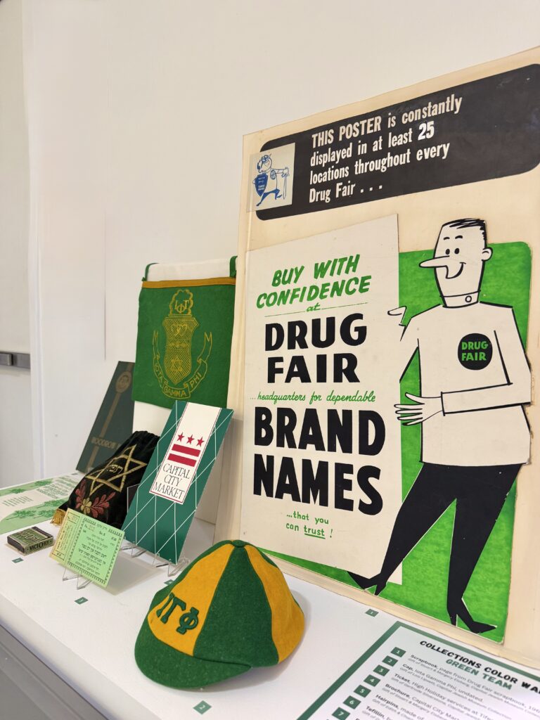 Green collection artifacts on view as part of a Collections Color War, August 2025.