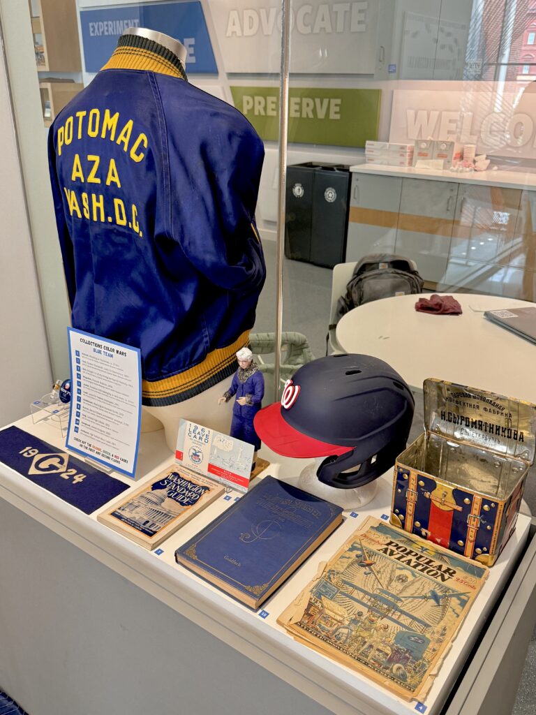 Blue collection artifacts on view as part of a Collections Color War, August 2025.