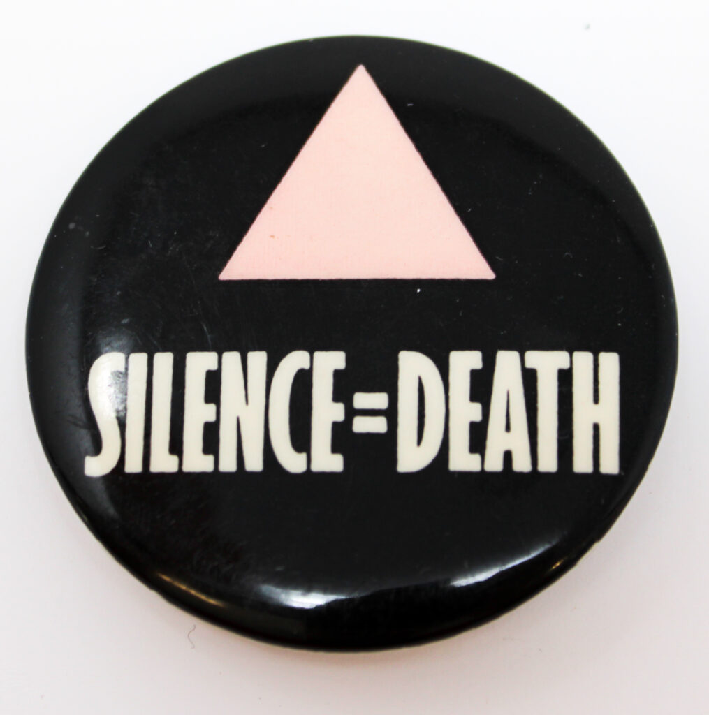 Black button featuring a pink triangle above the statement "silence=death," ca. 1987. Lillian and Albert Small Capital Jewish Museum Collection. Gift of Michael Garbus