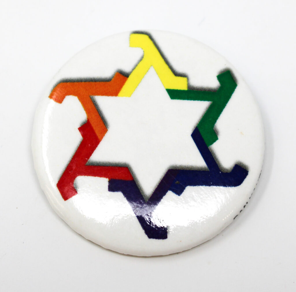 Button featuring interlocking, rainbow-colored lambda (Greek letter) in the shape of a six-pointed star; the logo of Bet Mishpachah, the LGBTQ+ synagogue of Washington, DC, ca. 2010s. Lillian and Albert Small Capital Jewish Museum Collection. Gift of Michael Garbus